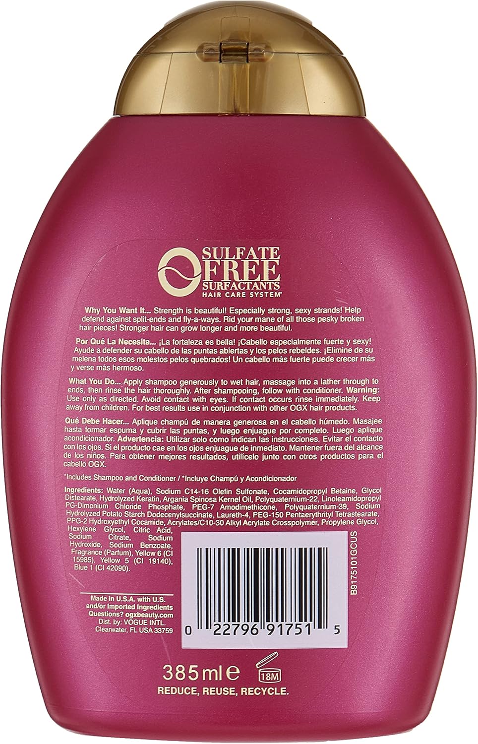 Eau, sulfonate d'oléfine C14-16 de sodium, cocamidopropyl bétaïne, chlorure de sodium, distéarate de glycol, kératine hydrolysée, huile de noyau d'arganier (Argania Spinosa), polyquaternium-22, PEG-7 amodiméthicone, dodécénylsuccinate d'amidon de pomme de terre hydrolysé de sodium, phosphate de chlorure de linoléamidopropyl PG-dimonium, polyquaternium-39, laureth-4, tétrastéarate de pentaérythrityle PEG-150, PPG-2 hydroxyéthyl cocamide, polymère croisé d'acrylates/acrylate d'alkyle en C10-30, propylène glycol, citrate de sodium, hexylène glycol, acide citrique, hydroxyde de sodium, benzoate de sodium, acide formique, phénoxyéthanol, sorbate de potassium, acétate de tocophéryle, bicarbonate de sodium, tétrapropénylsuccinate disodique. Glycérine, acide de noix de coco, parfum, hexyl cinnamal, linalol, coumarine, CI 19140/Jaune 5, CI 15985/Jaune 6, CI 42090/Bleu 1.